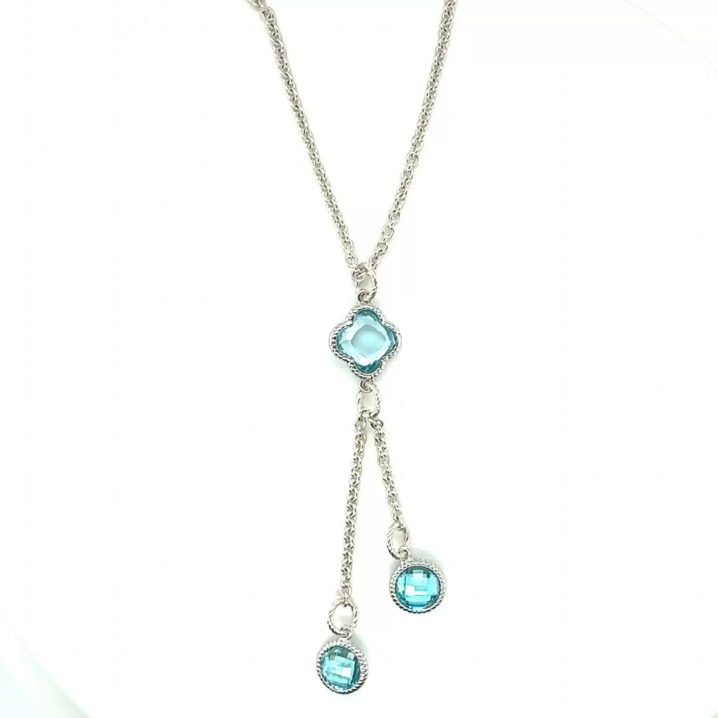Very pretty aquamarine drop pendant necklace with its main flower pendant and two, offset, eye charms. This eye catching piece looks stunning on belcher chain with Albert swivel catch .