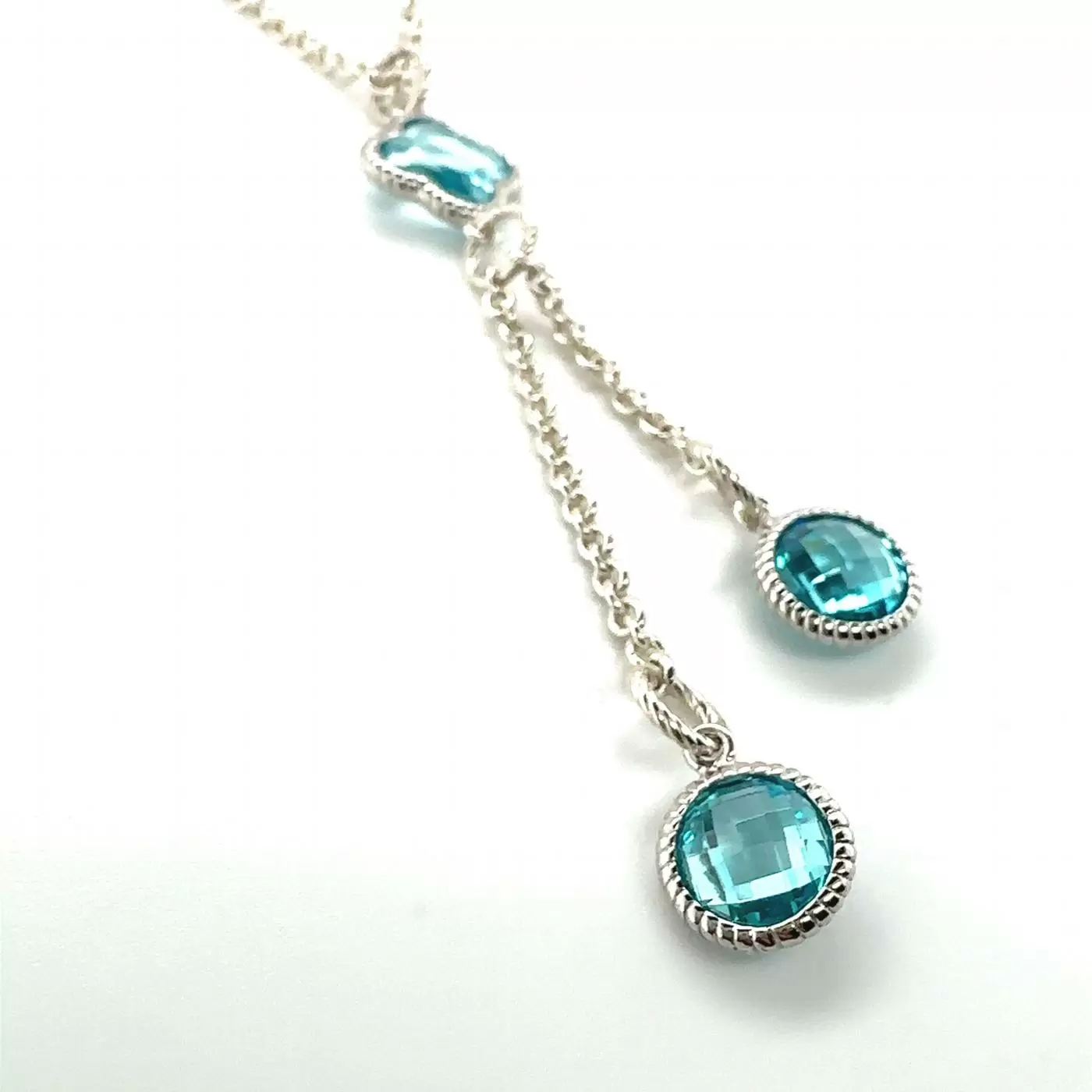 Sterling silver belcher chain pendant with three aquamarines attached with 2 chains with twist pendant loops.